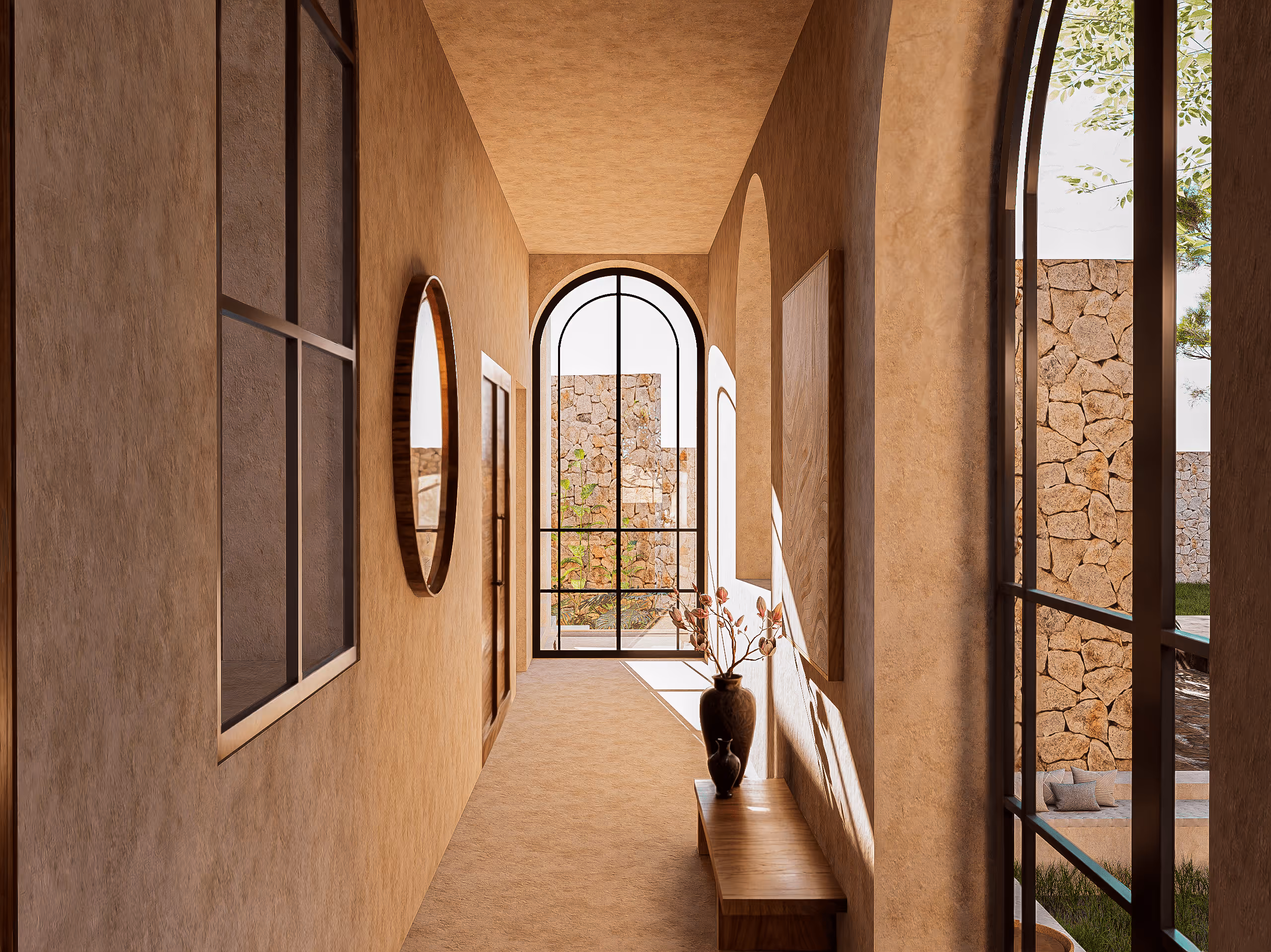 INSPIRADA EN ESTILOS COLONIALES Y MEDITERRÁNEOS, ESTA CASA REFLEJA LA HONESTIDAD EN SUS MATERIALES RUSTICOS, PERO CON UN MANEJO DELICADO EN CUANTO A LA ILUMINACIÓN DE CADA ESPACIO, LOS REMATES VISUALES Y LA TRANSICIÓN ENTRE CADA AMBIENTE. EL ESQUEMA EN “L“ SE DESARROLLA A PARTIR DE UN ÁLAMO UBICADO EN EL CENTRO DEL TERRENO COMO ELEMENTO ORDENADOR , EL CUAL SE APRECIA DESDE DISTINTOS ANGULOS DE LA CASA. EL PROGRAMA SEPARA LAS ÁREAS DE SERVICIO, AREAS SOCIALES Y AREAS PRIVADAS, LAS CUALES SE DISTRIBUYEN A PARTIR DE UN ESPACIO ARTICULADOR QUE TIENE LA FUNCIÓN DE SALÓN/ COMEDOR Y COCINA, MISMOS QUE SE CONECTAN CON LA TERRAZA, PISCINA Y EL GRAN PROTAGONISTA DEL PROYECTO, EL ÁRBOL DEL ÁLAMO SE APROVECHARON LAS DIMENSIONES DEL TERRENO PARA GENERAR VISTAS Y JARDINES PRIVADOS DESDE CADA ESPACIO, CON DISEÑO DE PAISAJE.