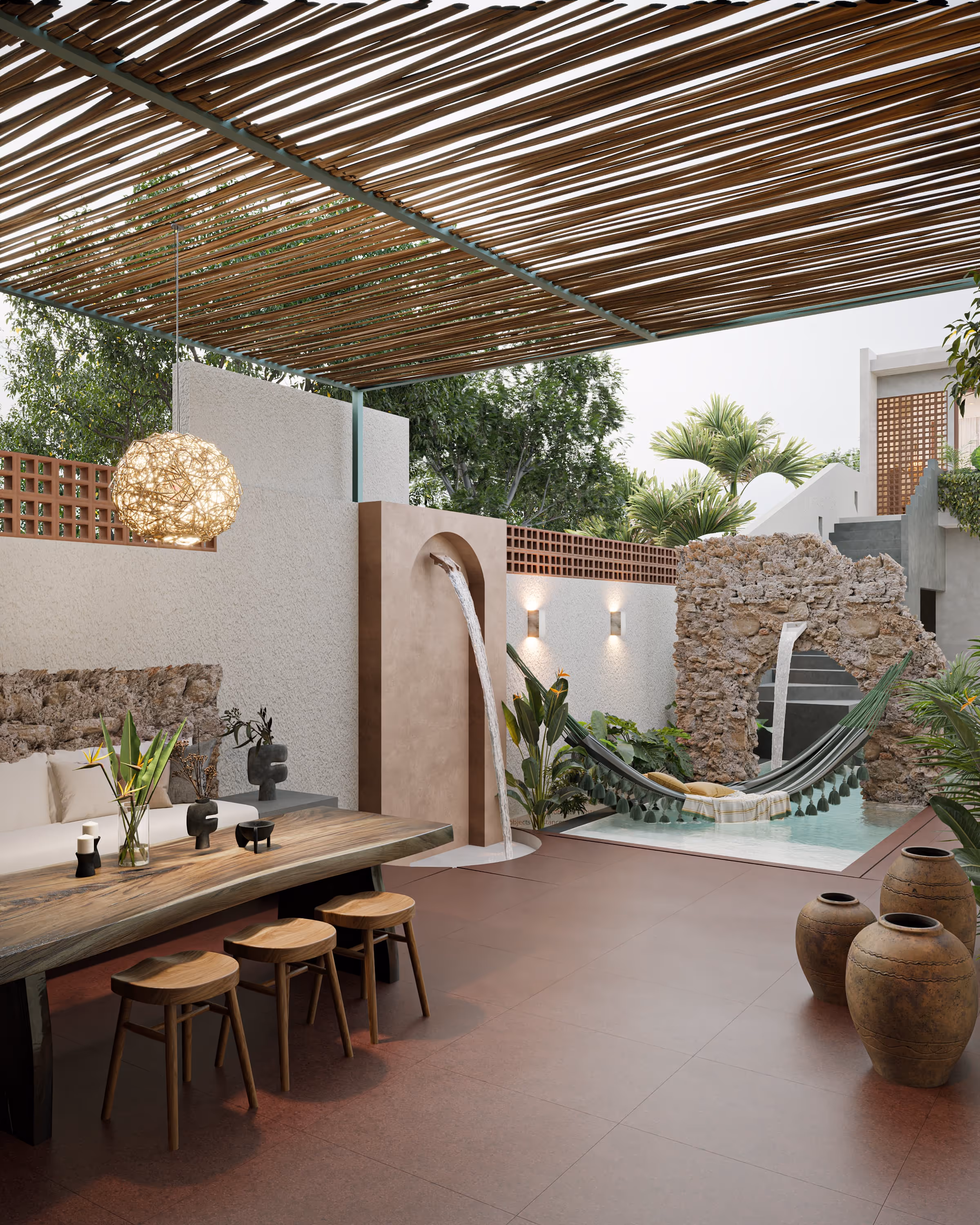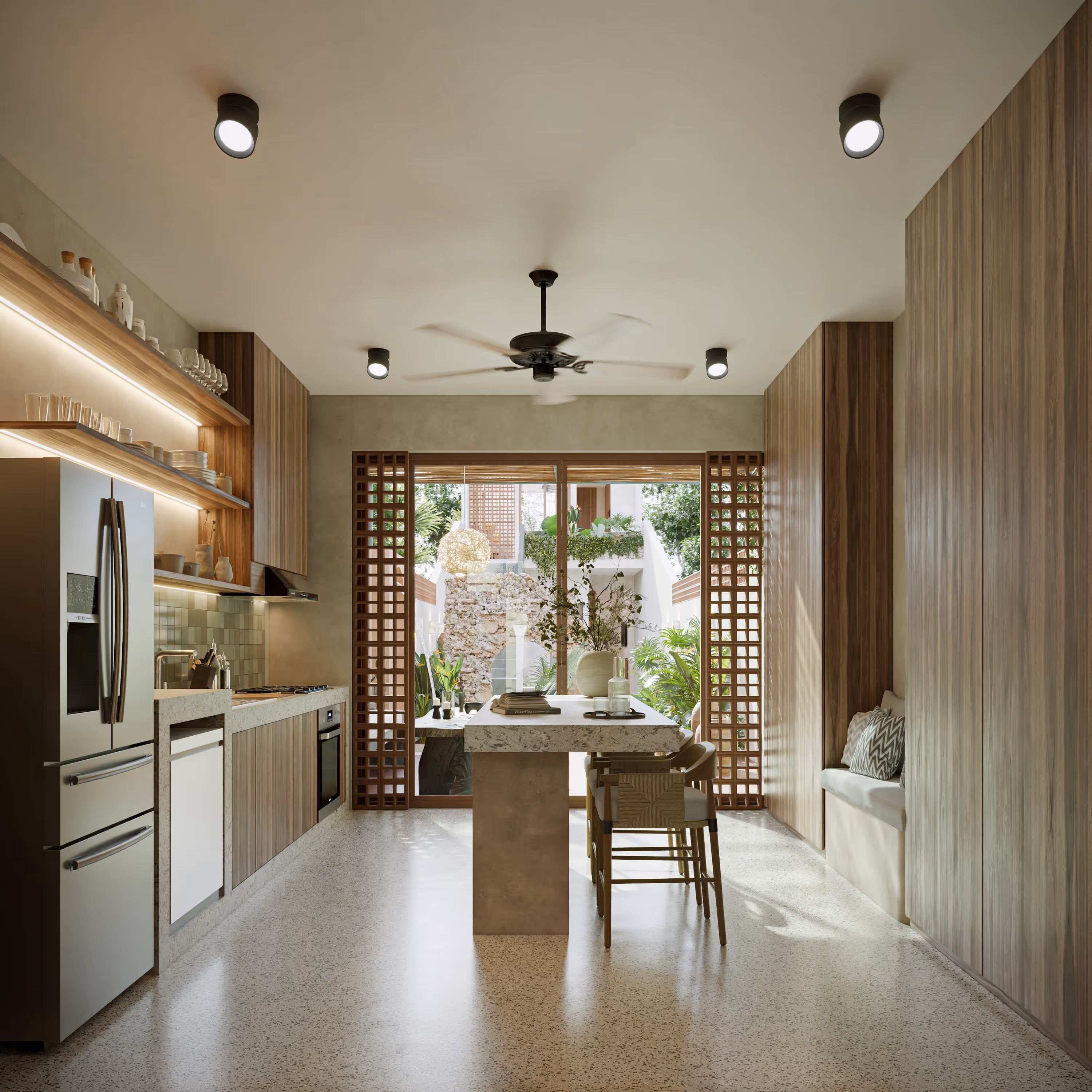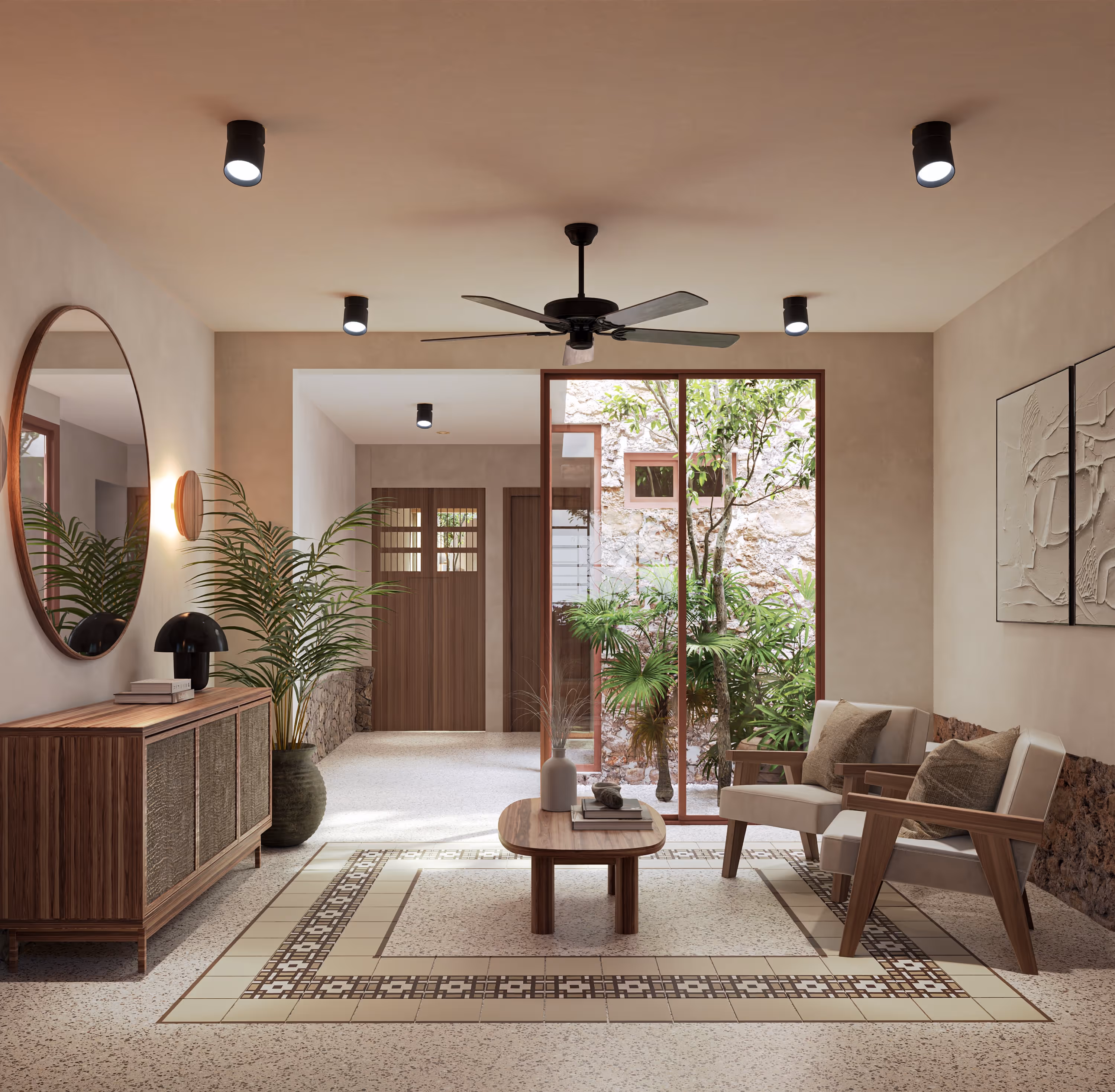 UBICADA EN UNO DE LOS BARRIOS MÁS BONITOS Y AUTÉNTICOS DEL CENTRO DE MÉRIDA. ESTA CASA UNIFAMILIAR DE 2 NIVELES COMBINA DISEÑO CLÁSICO CONTEMPORÁNEO CON MATERIALES NATURALES Y DETALLES ARTESANALES. SIENDO ANTERIORMENTE UNA CARPINTERÍA, EL PROYECTO PARTE DE LA RENOVACIÓN DE LA CONSTRUCCIÓN EXISTENTE Y LA GENERACIÓN DE NUEVOS ESPACIOS, LOS CUALES SE VAN DESCUBRIENDO CONFORME VA INTERNÁNDOSE A LA PROPIEDAD. NOS RECIBE UN VESTÍBULO CON JARDÍN INTERIOR QUE PROPORCIONA LUZ Y VENTILACIÓN AL ESPACIO. EL PROGRAMA SE DESARROLLA A TRAVÉS DE PATIOS ABIERTOS ALTERNADOS CON ESPACIOS CONSTRUIDOS PARA GENERAR DISTINTOS AMBIENTES, GENERANDO UNA BUENA ILUMINACIÓN Y VENTILACIÓN NATURAL. SE UTILIZARON MATERIALES Y ELEMENTOS ARTESANALES COMO PISOS EN TERRAZO, MUROS EN CHUKUM Y MAMPOSTERÍA, MOSAICOS DE PASTA, CELOSÍAS DE CONCRETO DE PROVEEDORES LOCALES, Y BAHAREQUE EN LAS CUBIERTAS DE TERRAZAS. UNA CASA COMPLETAMENTE EQUIPADA EN INSTALACIONES, CON TERRAZAS Y ESPACIOS EXTERIORES, UBICADA EN EL CENTRO HISTÓRICO DE MÉRIDA